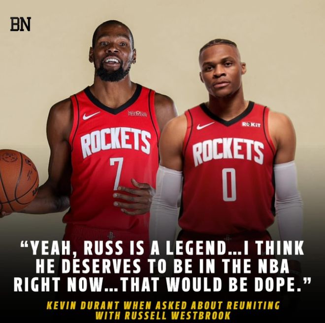 最近,威少的名字也與火箭聯系在一起。杜蘭特在播客節目上承認自己聽到過一些流言,但表示“關于簽下威斯布魯克的討論,從未傳到我這里”。